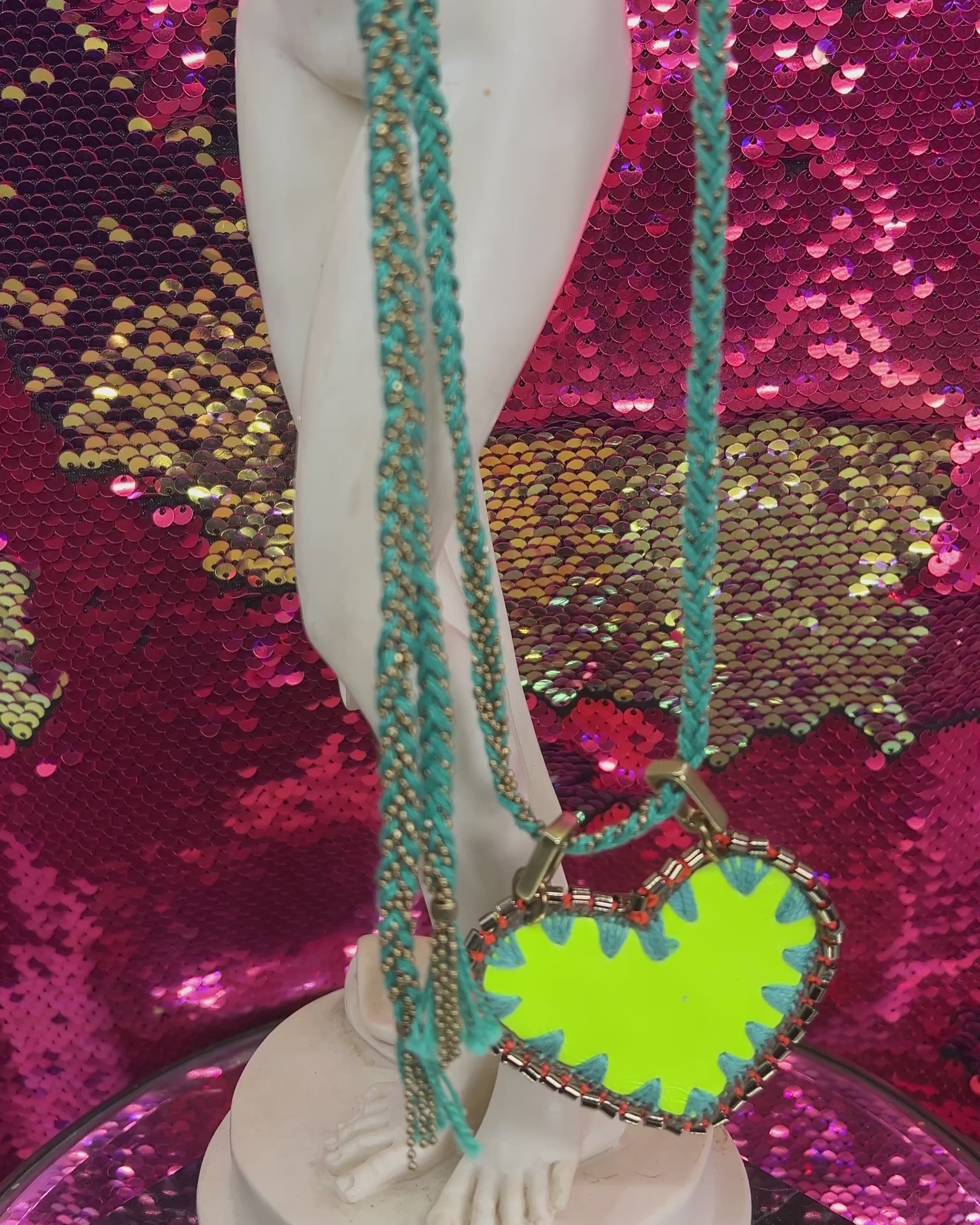 Fall in love with our hand shape hart necklace, our handcrafted necklace that celebrates the beauty of art jewelry craftsmanship. A gleaming brass heart, approximately 3" wide by 2" tall, forms the centerpiece. This heart is then adorned with intricate crocheted textiles, adding a touch of texture and artistry. Delicate brass beads add a touch of shine, while the exclusive De Petra Lariat, handcrafted from brass and cotton, provides a sophisticated and adjustable way to wear this unique piece.