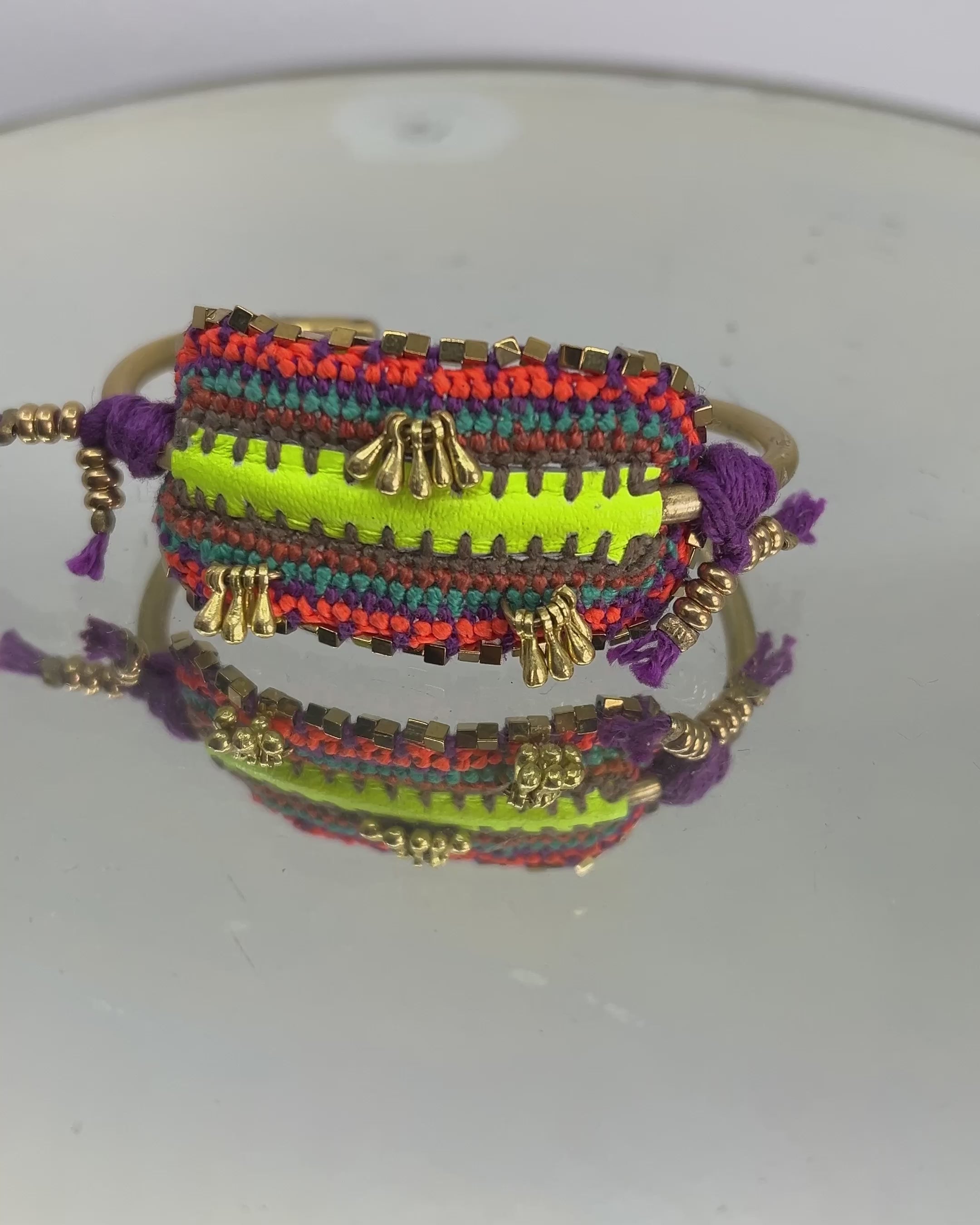 Complementing these elements is rich Italian leather, known for its superior quality and supple texture. The leather is dyed in deep, earthy tones, providing a striking contrast to the crochet and brass. It wraps securely around your wrist, the aroma of genuine leather a subtle yet constant reminder of its authenticity and heritage.