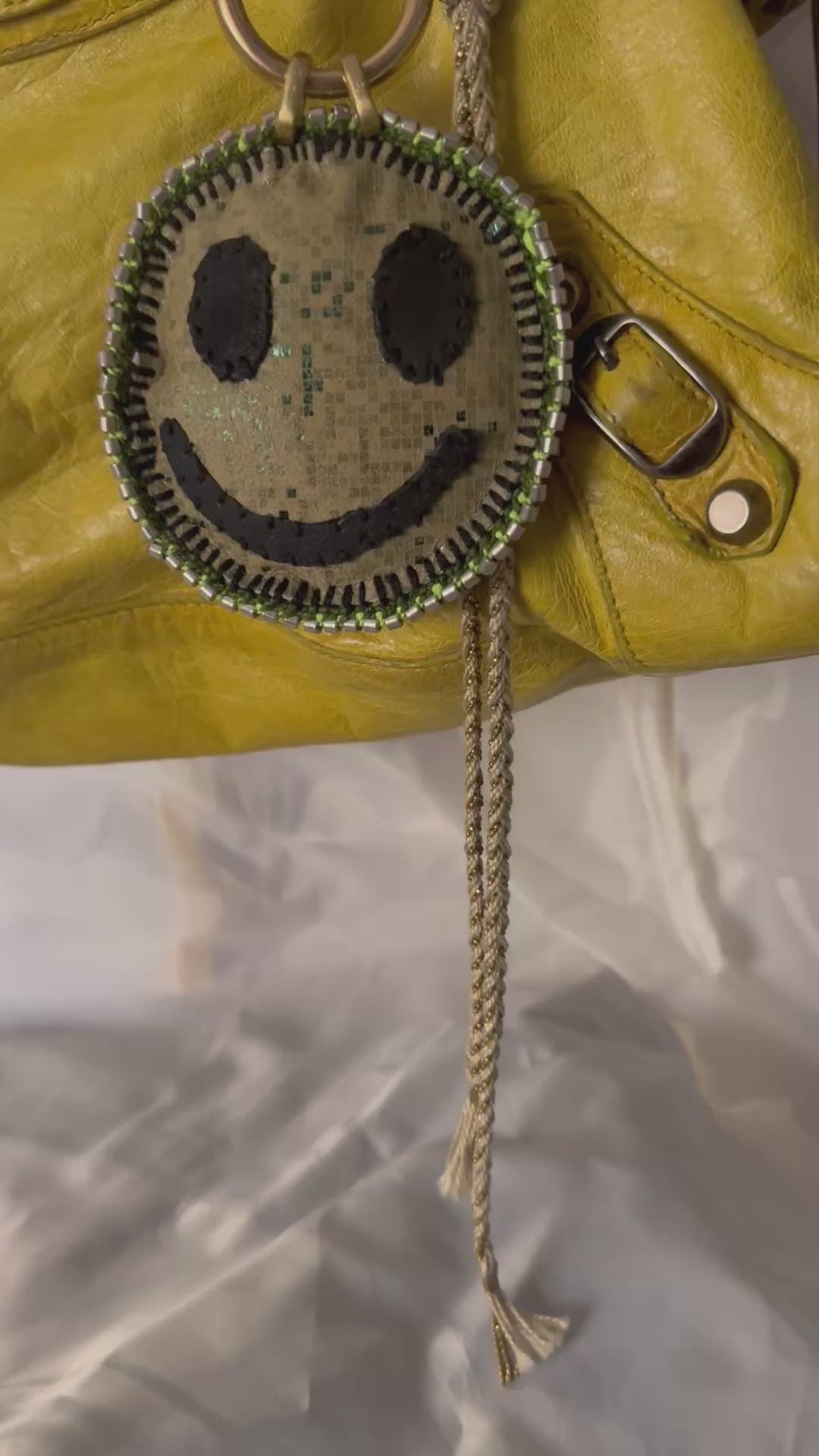This charm features a meticulously hand-braided De Petra lariat crafted from organic cotton thread and finished with substantial solid brass hardware. The centerpiece is a "Happy Face" icon rendered in fine Italian leather, signifying a spirit of optimism and light.