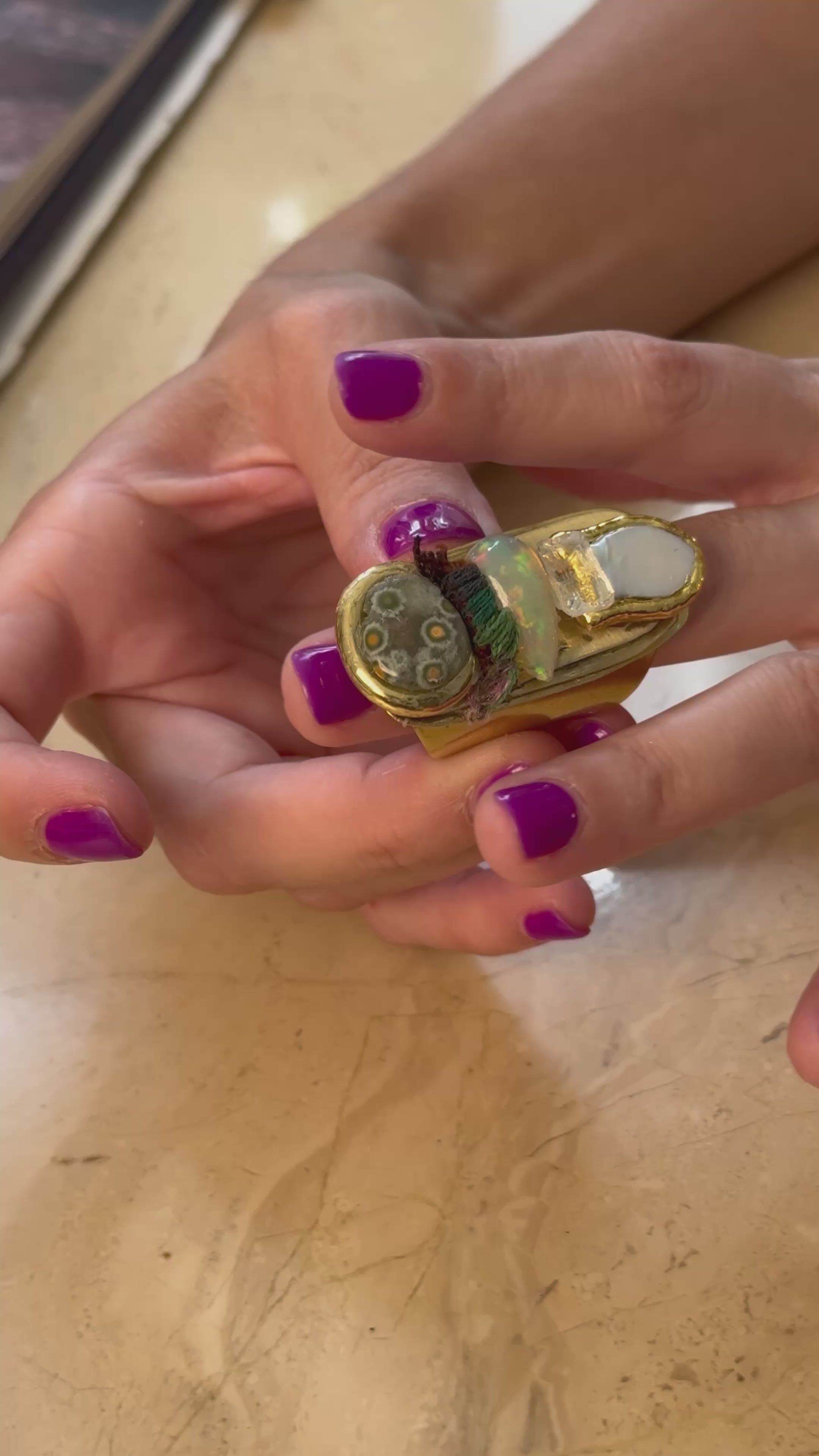 The Serene Current Ring is a symbolic composition that unites elements of the sea (pearl, ocean jasper) with stones of emotional light (kunzite, opal). The harmonious arrangement of these materials in a fluid, artistic design captures a sense of tranquility and movement. Its adjustable nature ensures the ring rests beautifully on your finger, making it a truly personal treasure.